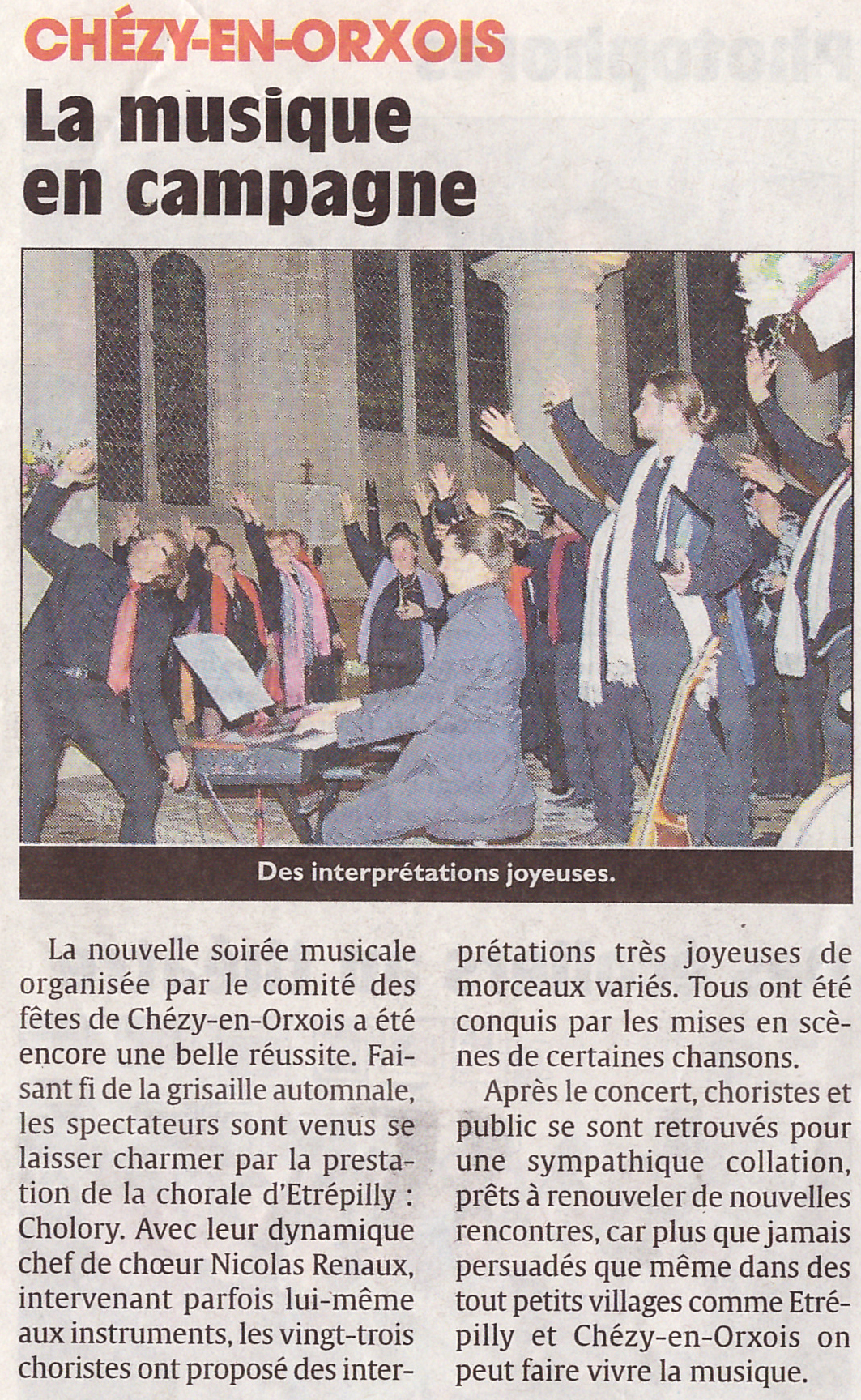 ……Fanny Publier , amoureuse de la chanson rêve de pouvoir extérioriser cette passion; elle décide, alors, de fonder une chorale à Etrépilly. Rappelons que ce village dénombre moins d’une centaine d’âmes, mais de sa ténacité nait une association :CHOLORY.